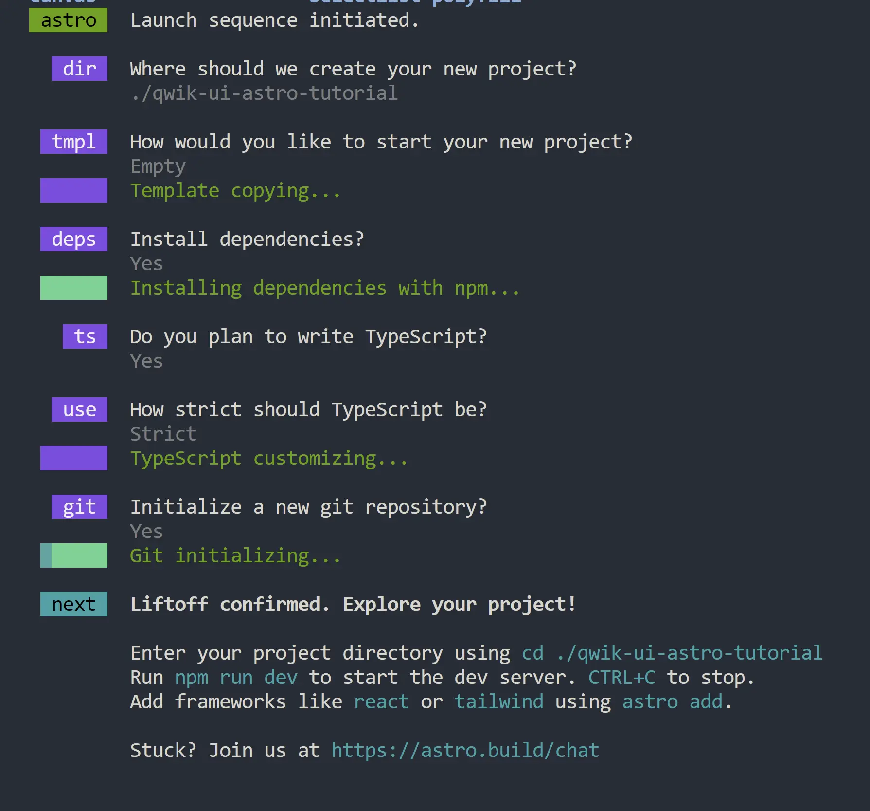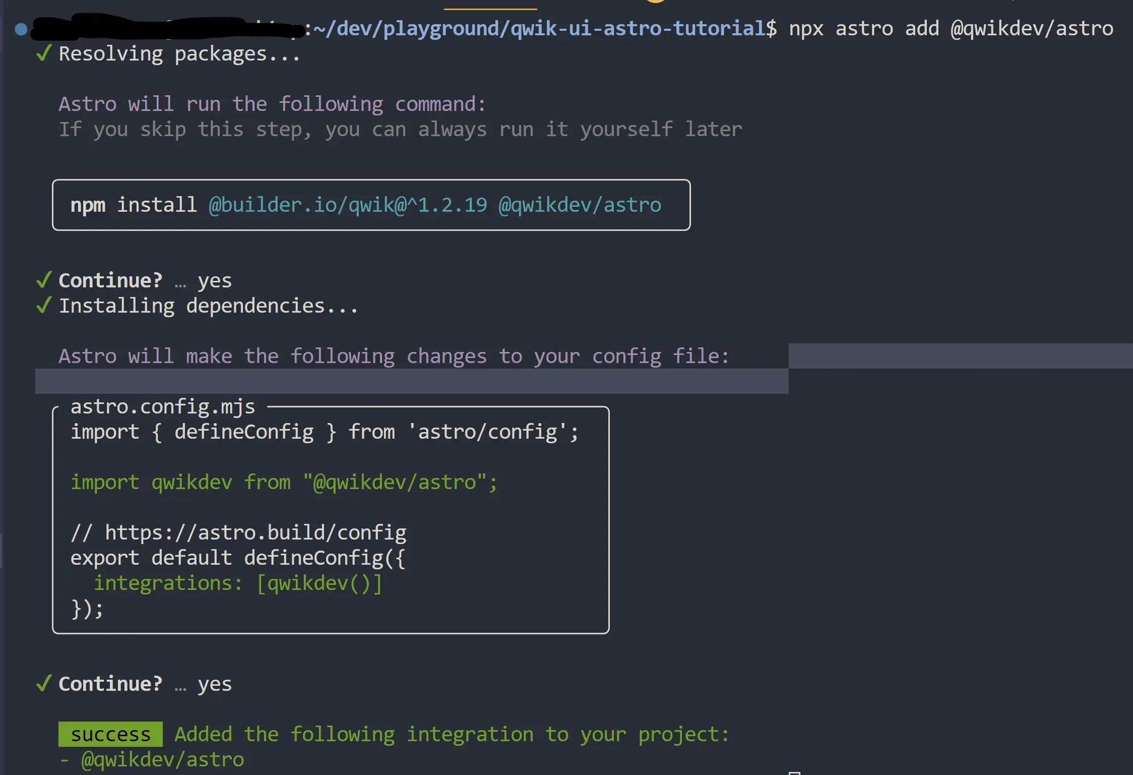 Next, let's add the @qwikdev/astro integration. This integration allows us to leverage resumability and Qwik components inside of Astro.